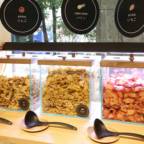 店内では、厳選された20種類ほどの天然素材のおやつをビュッフェ形式でお選びいただけます。